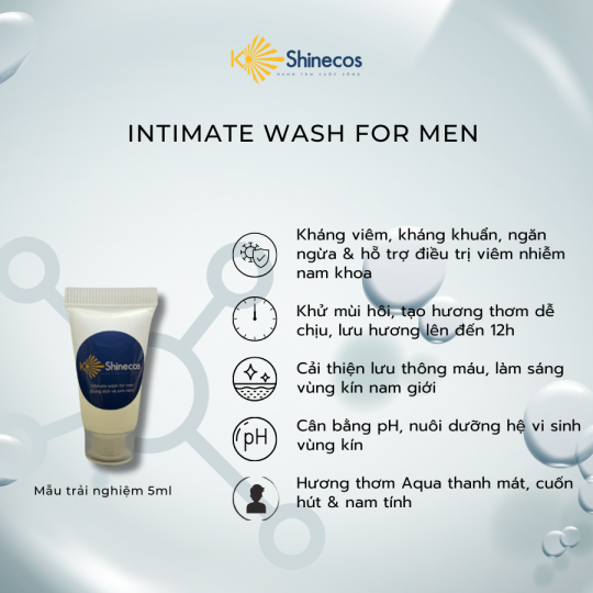 Mẫu trải nghiệm dung dịch vệ sinh nam giới Intimate Wash For Men lưu hương thơm mát đến 12 giờ, với khả năng làm sạch sâu bụi bẩn, mồ hôi, vi khuẩn nhưng không làm mất cân bằng pH và độ ẩm mịn làn da vùng kín, giúp kháng khuẩn giảm ngứa ngáy, mẩn đỏ và hỗ trợ ngăn ngừa và bảo vệ “cậu nhỏ” khỏi các dấu hiệu viêm nhiễm.